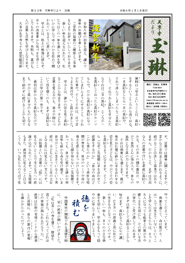 天寧寺では毎年、正月とお盆の年二回、天寧寺だより『玉琳(ぎょくりん)』を発行しております。お寺の行事の案内、仏教の教え、曹洞宗の教えなどを分かりやすくお伝えしていきます。『玉琳』とは天寧寺の山号の「玉琳山」にちなんで名付けさせていただきました。この『玉琳』によって、お寺を身近に感じていただき、素朴な疑問や仏教のことを少しずつ学んでいただけたら幸いです。