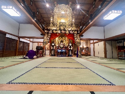 瓦屋根を土葺きから乾式で瓦を葺き直し屋根全体を軽量化し、本堂内に耐力壁を数カ所新設し、屋根裏に筋交いを設けました。雨漏りがひどい本堂奥の位牌堂の全面改修と拡張、内陣の改修、畳の全面張り替え、本堂・三宝殿・茶室のエアコンの新設、須弥壇の新設、天蓋や位牌などの仏具の洗いや修理を行いました。
