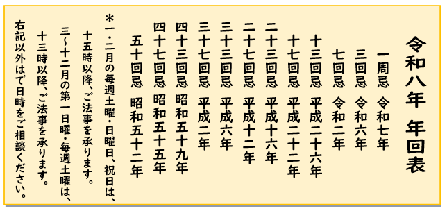 下記の年回表で各家のご先祖様の年忌をご確認いただき、会場(お寺・自宅)を決めていただき、希望日の3週間前までにご予約ください。特に土、日、祝日はお早めにお申し込み下さい。